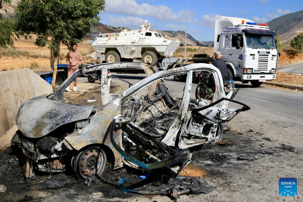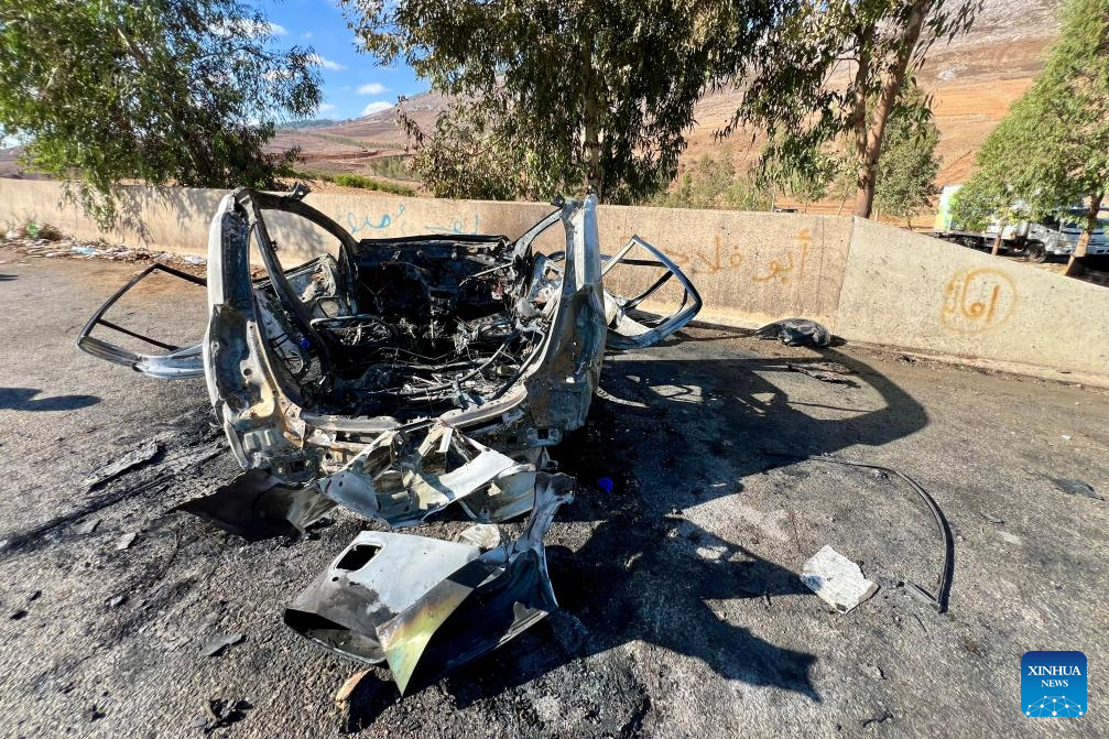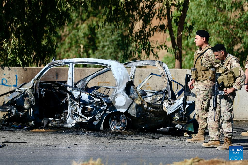 The Lebanese Health Ministry's Public Health Emergency Operations Center said in a release that the Israeli strike on a car on the Jarmaq/Khordali road near the city of Nabatieh, deep in the south, resulted in two deaths and one injury. The official Lebanese National News Agency (NNA) said it was a drone attack. (Photo by Ali Hashisho/Xinhua)