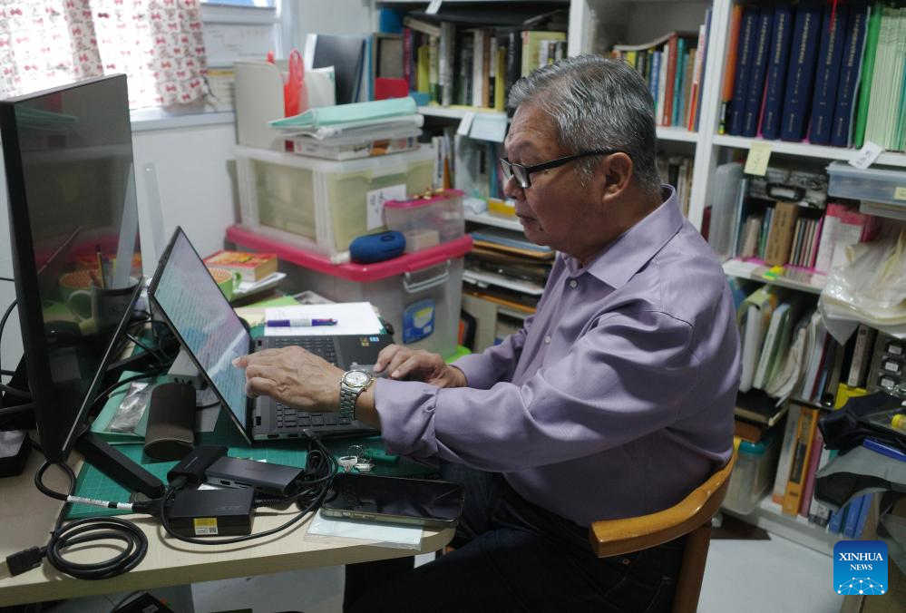 Singaporean scholar Lim Shao Bin checks copies of archival materials at his home in Singapore on Aug. 23, 2025.(Xinhua/Shu Chang)