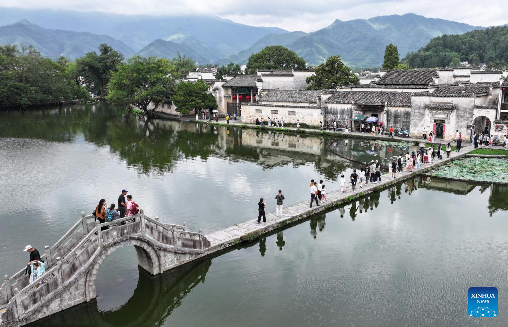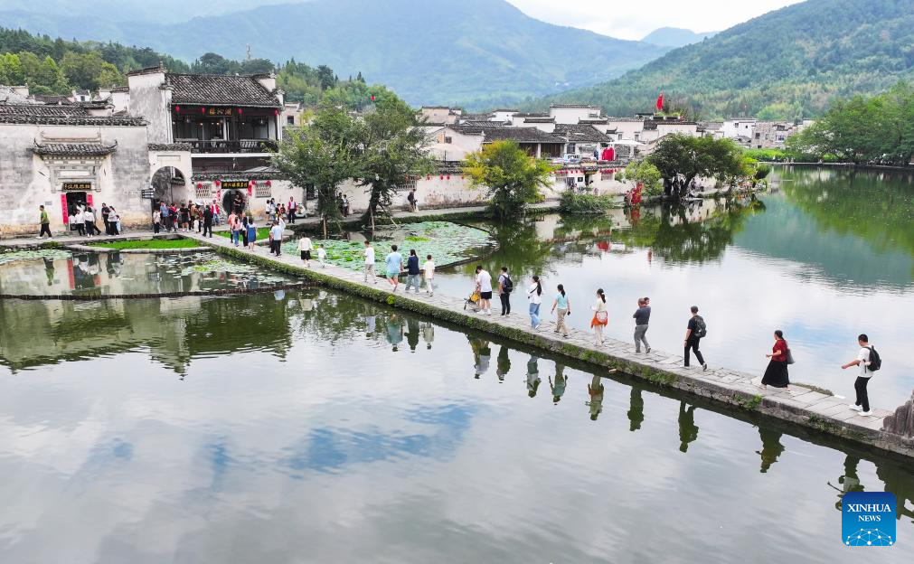 A drone photo taken on Oct. 1, 2025 shows tourists visiting Xidi Village of Yixian County, Huangshan City, east China's Anhui Province. The historical villages of Xidi and Hongcun, both UNESCO World Heritage sites in Yixian County of Anhui Province, welcomed a large number of tourists on the first day of the National Day holiday with its elegant architecture and beautiful scenery. (Xinhua/Du Yu)