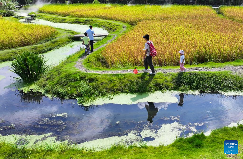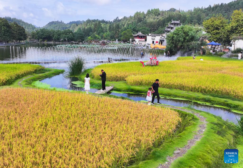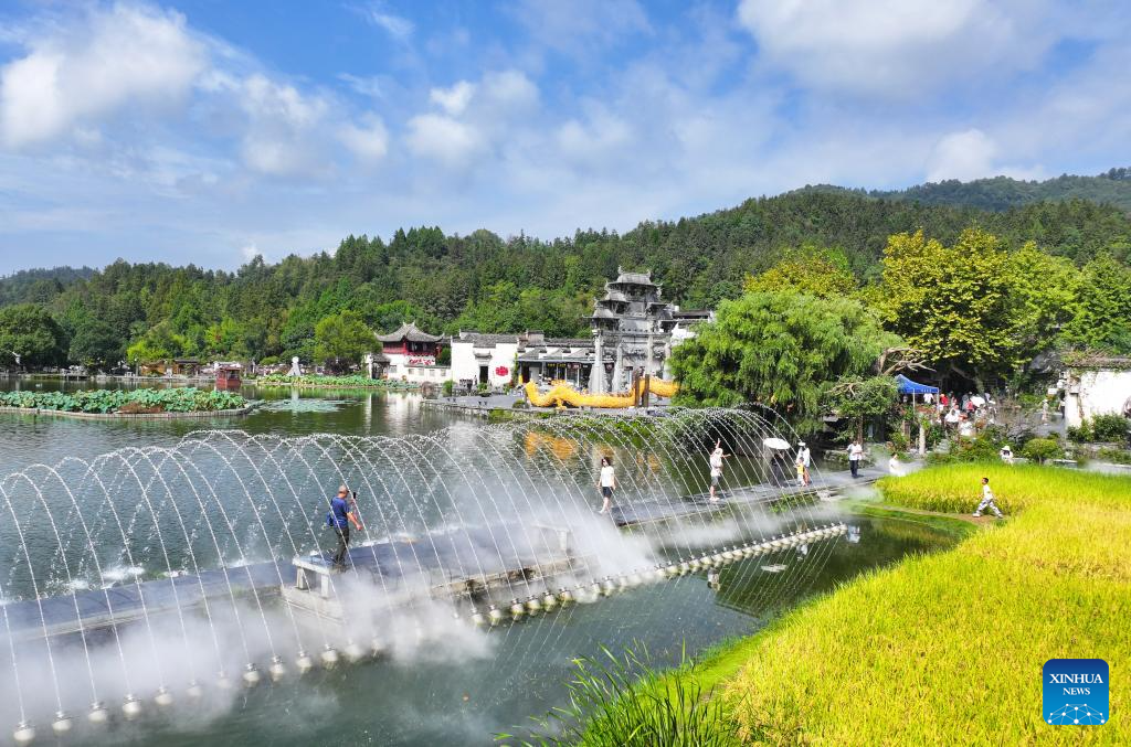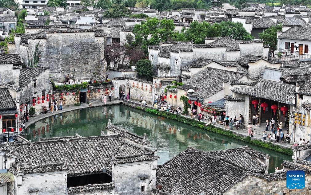 A drone photo taken on Oct. 1, 2025 shows tourists enjoying leisure time in Xidi Village of Yixian County, Huangshan City, east China's Anhui Province. The historical villages of Xidi and Hongcun, both UNESCO World Heritage sites in Yixian County of Anhui Province, welcomed a large number of tourists on the first day of the National Day holiday with its elegant architecture and beautiful scenery. (Xinhua/Du Yu)