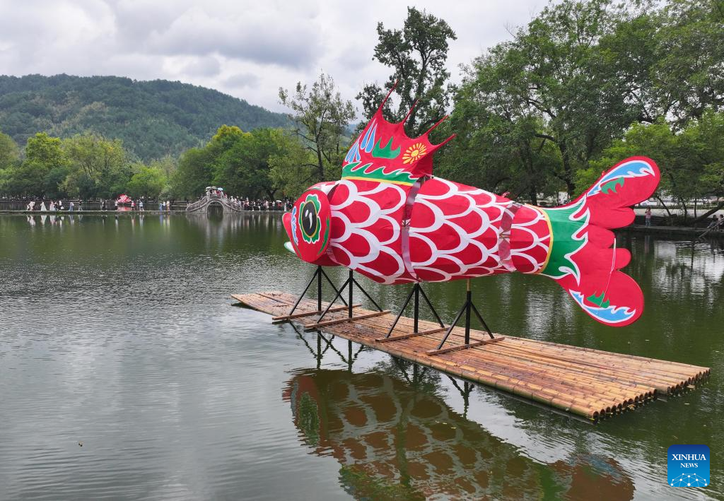 A drone photo taken on Oct. 1, 2025 shows tourists enjoying leisure time in Hongcun Village of Yixian County, Huangshan City, east China's Anhui Province. The historical villages of Xidi and Hongcun, both UNESCO World Heritage sites in Yixian County of Anhui Province, welcomed a large number of tourists on the first day of the National Day holiday with its elegant architecture and beautiful scenery. (Xinhua/Du Yu)