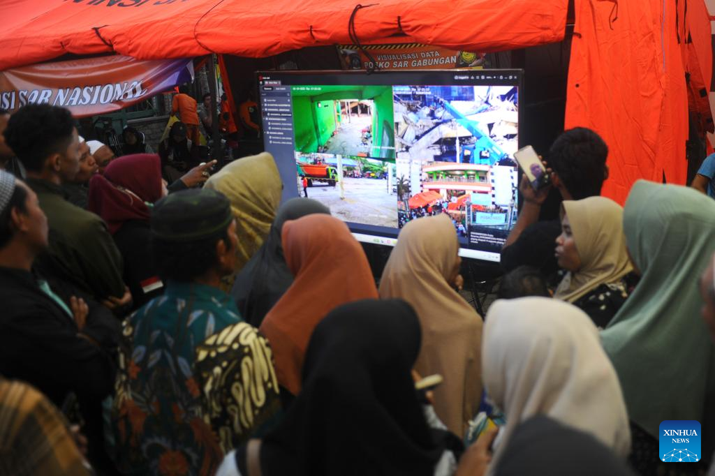 Relatives of victims watch the live broadcast of rescue operations at the site of a collapsed school building at Al Khoziny Islamic Boarding School in Sidoarjo district, East Java, Indonesia, Oct. 2, 2025. Rescuers have so far detected no further signs of life under the rubble of a collapsed school building in Indonesia's East Java province, the country's disaster agency said on Thursday.