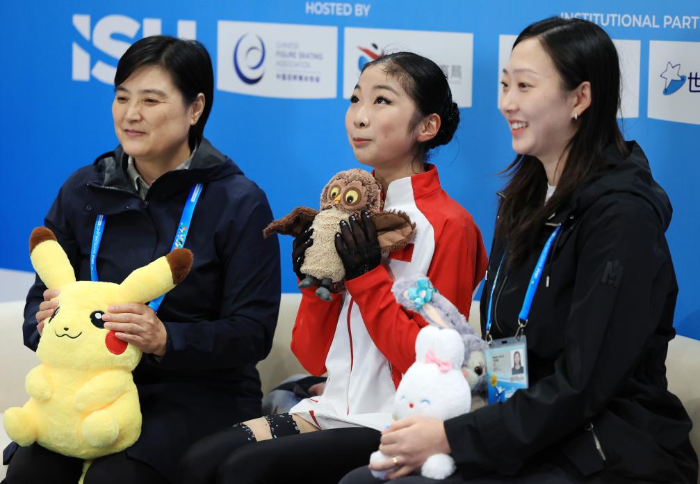 9月19日,张瑞阳(中)在女子单人滑短节目比赛后等待成绩。新华社记者 张晨霖 摄
